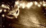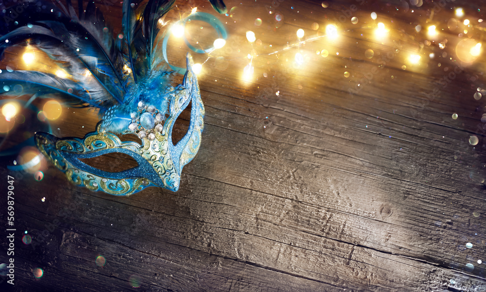 Venetian Mask On Wooden Table With Defocused Bokeh Lights In Dark