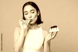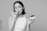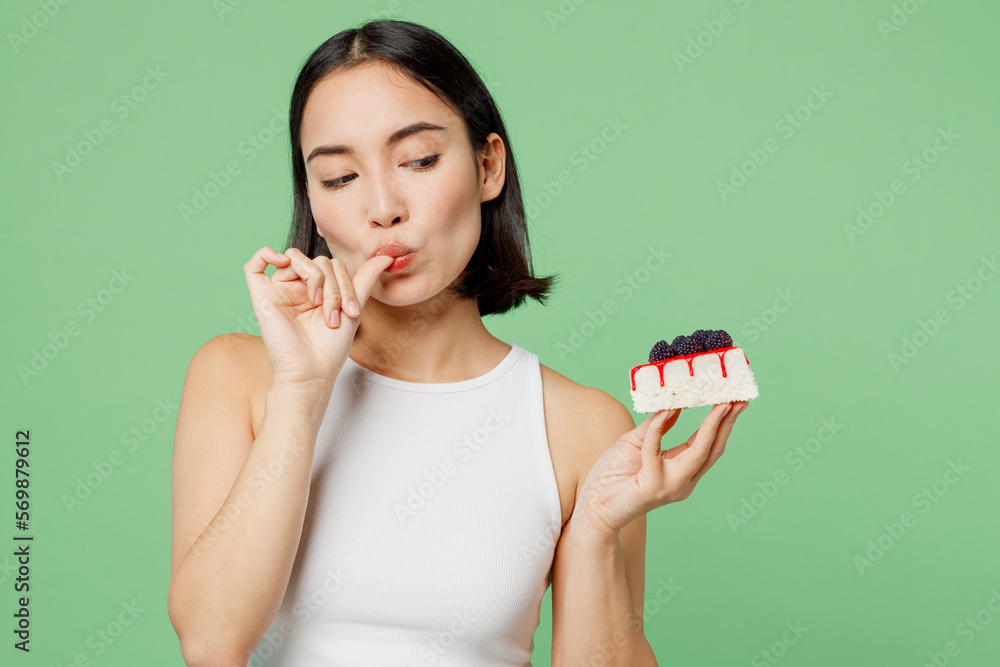 Young happy fun woman wear white clothes holding in hand pice of cake dessert lick fingers isolated on plain pastel light green background. Proper nutrition healthy fast food unhealthy choice concept.