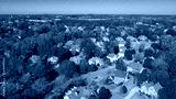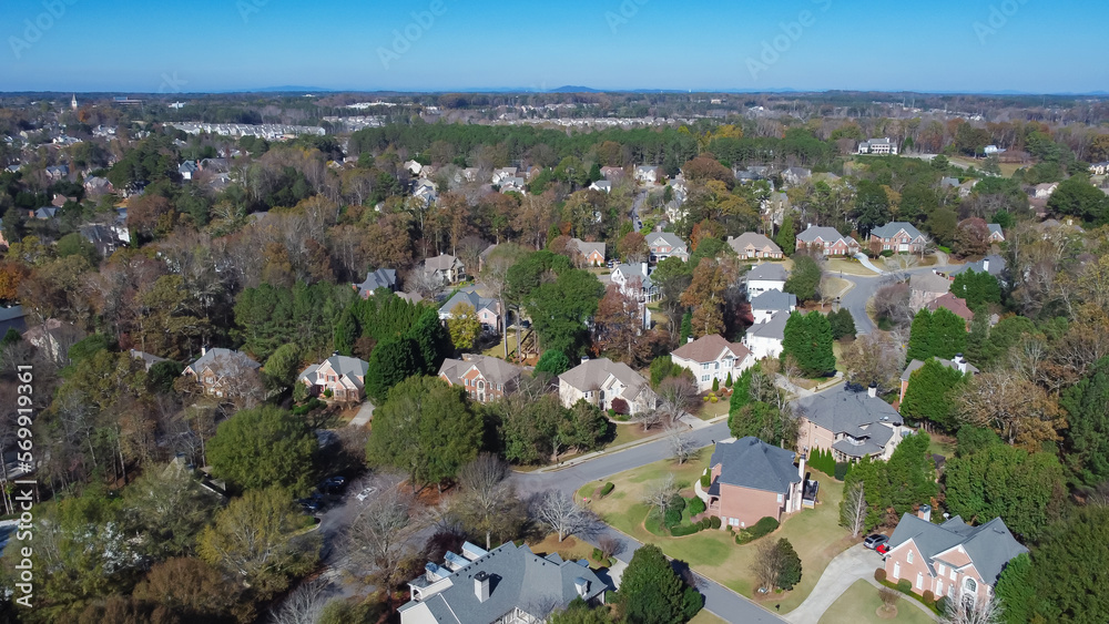 Chestnut mountain in far background and row of upscale two-story house with shingle roof and lush green trees in leafy suburbs Atlanta, Georgia, USA