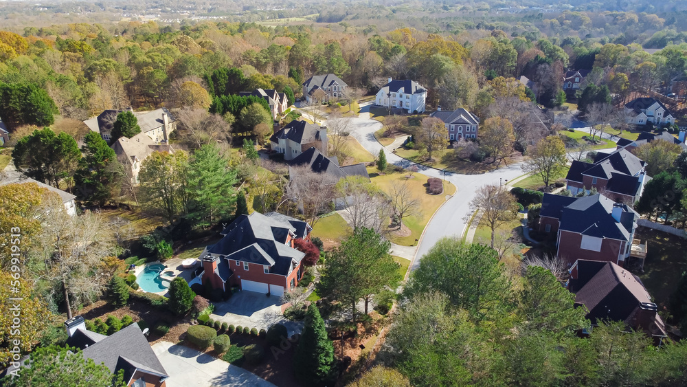 Upscale houses with swimming pool situated in leafy suburb residential neighborhood with cul-de-sac and lush green trees near Atlanta, Georgia, US