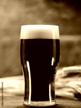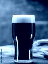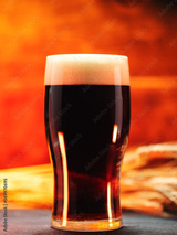 A glass of dark beer on a wooden table with ears of wheat. Back light