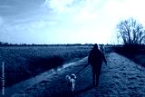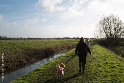 Woman seen walking her Poodle by a small river in a rural location. The Poodle is wearing a dog coat due to the low temperature.