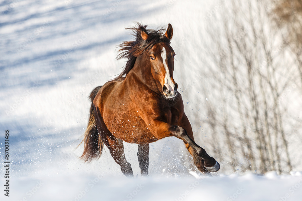Portrait of a young brown arab x berber horse galloping across a snowy winter paddock outdoors