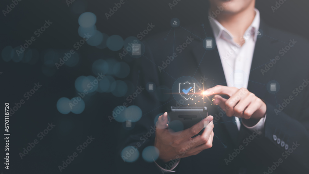 Businessman showing online document validation icon, Concepts of practices and policies, company articles of association Terms and Conditions, regulations and legal advice, corporate policy