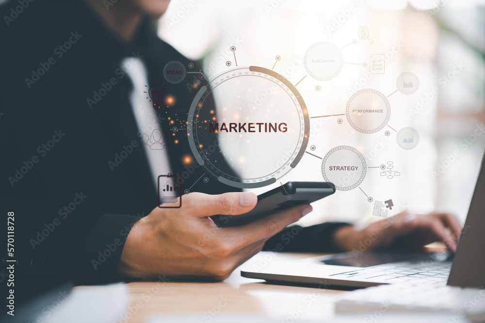 online marketing strategy planning ideas, performance assessment , and business growth, data analysis and problem solving , targeting , and search for new markets ,Businessman working with smartphone