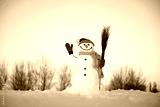 Funny snowman in knitted hat and yellow scalf with broom on snowy field. Blue sky on background