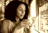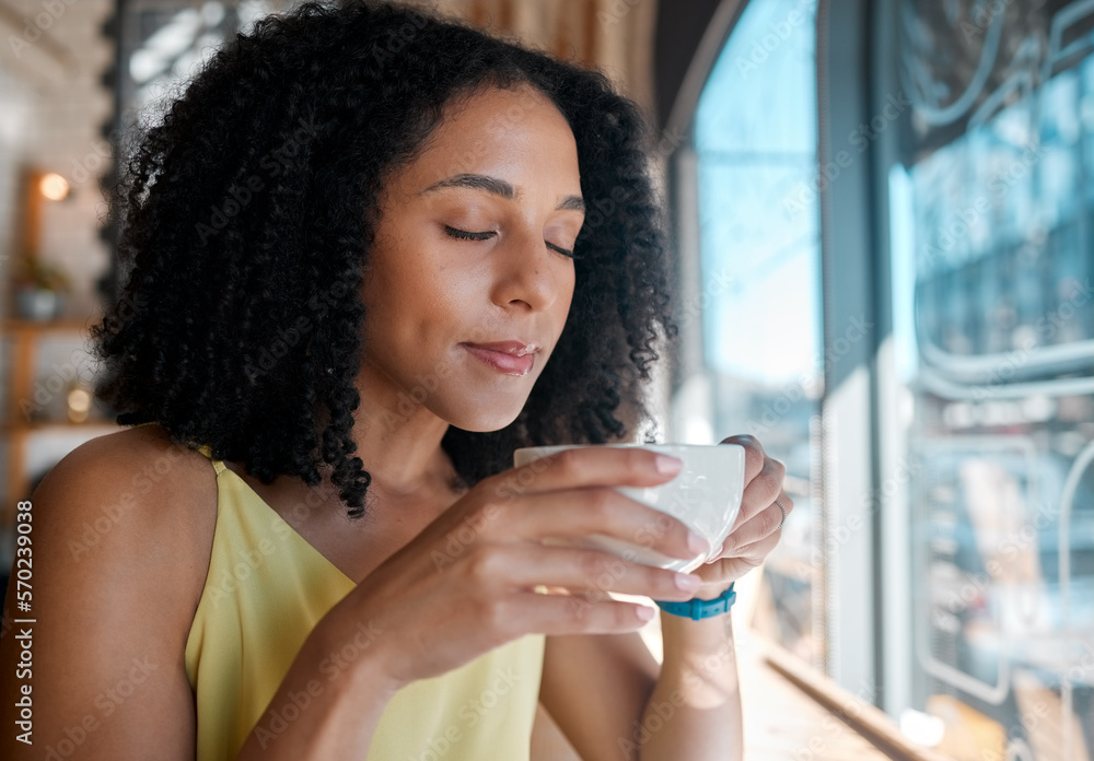 Black woman, relax or smelling coffee in cafe shop or restaurant for lunch break, mindfulness or self love zen. Thinking, student or person with tea cup aroma for drinking, inspiration or calm peace
