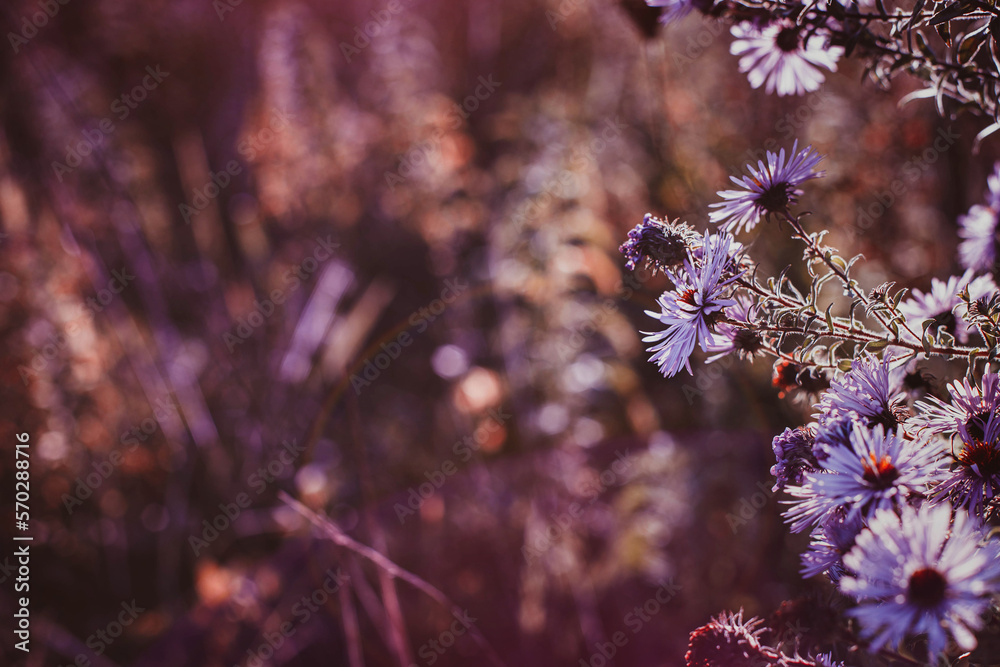 Selective soft focused Autumn wild grass and flowers on a meadow in the rays of the golden hour sun. Seasonal romantic artistic vintage autumn field landscape wildlife background with morning sunlight