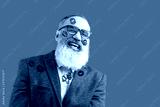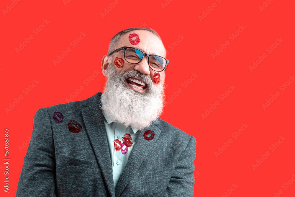 Senior laughing man with a gray beard in a light shirt in a dark casual jacket with lipstick marks on face skin and clothes. Bright red background
