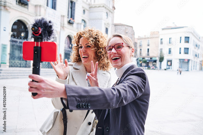 Two women using mobile phone with microphone while creating content for social media.