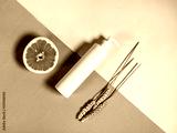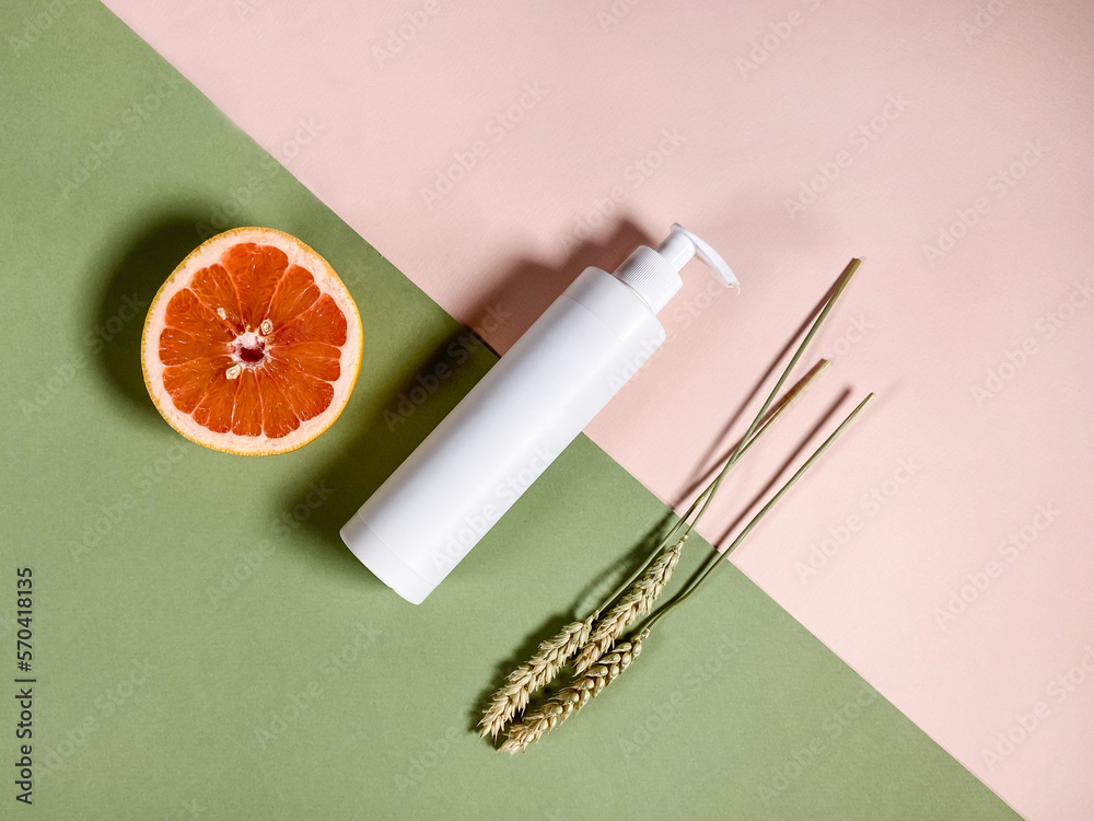top view of white blank pump plastic bottle, half of fresh grapefruit and natural dried ears on color paper background