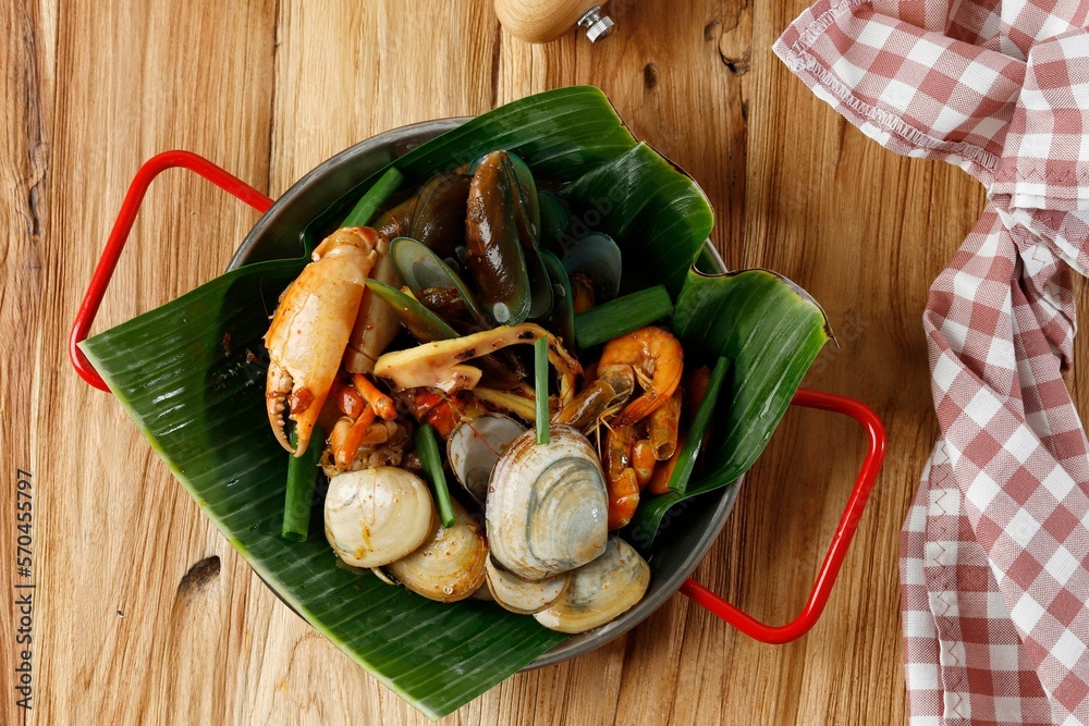Seafood Bancakan, Spicy Mixed Seafood Soup with Saus Padang.