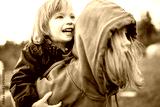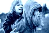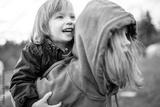 Cute big sister cuddling with her toddler brother. Adorable preteen girl piggybacking her small sibling. Children with large age gap.