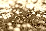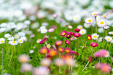 Beautiful meadow in springtime full of flowering white and pink common daisies on green grass. Daisy lawn.