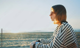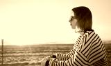 Teenage girl sits by the sea at sunset.