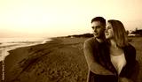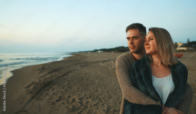 Attractive couple at sunset by the sea.