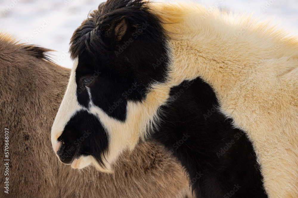 Portrait of a white black Icelandic horse on the snowy field.
