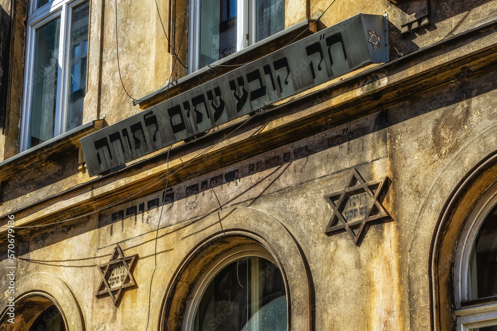 Jewish building with Shield of David and text in Jewish Quarter Krakow