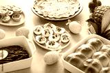 Easter brunch table with ham, quiche, hot cross buns