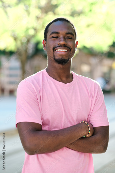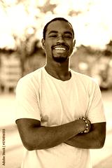 Man looking at camera and smiling while posing with arms crossed outdoors.