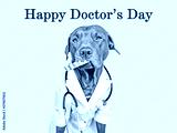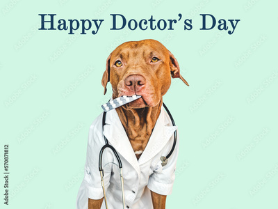 Happy Doctor's day. Lovable, pretty puppy, dressed in a doctor's coat. Closeup, indoors. Studio photo. Pets care concept