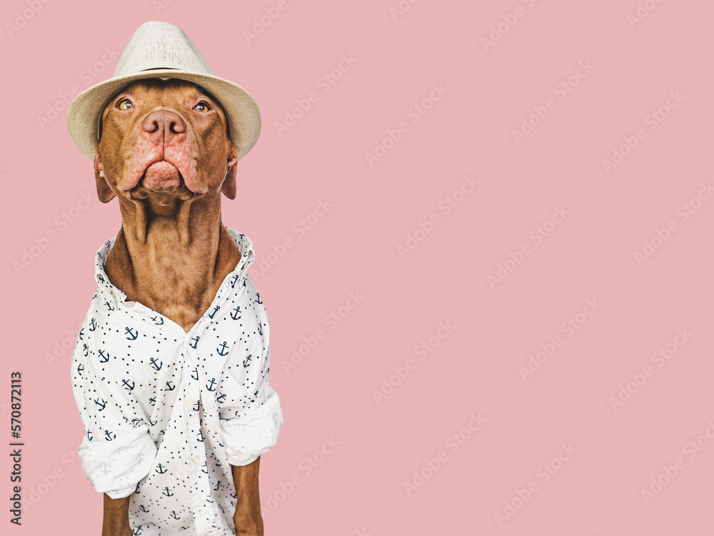 Lovable, pretty brown puppy and a white sun hat. Travel preparation and planning. Close-up, indoors. Studio photo, isolated background. Concept of recreation, travel and tourism. Pets care
