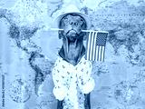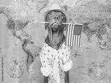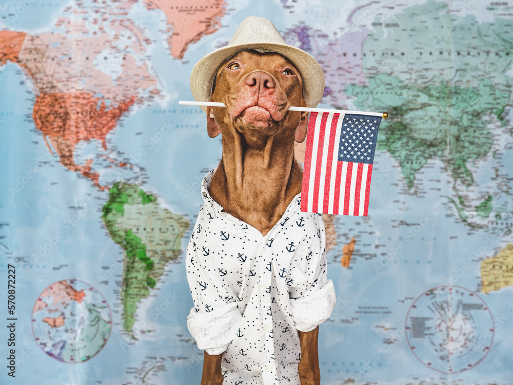 Charming brown puppy, sunglasses, sun hat and American flag. Travel preparation and planning. Closeup, indoors. Studio shot. Vacation, travel and tourism concept. Pet care