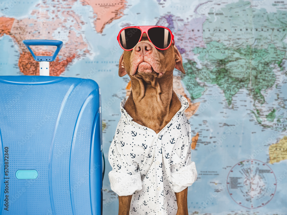 Cute brown puppy and a blue travel suitcase. Travel preparation and planning. Close-up, indoors. Studio photo, isolated background. Concept of recreation, travel and tourism. Pet care