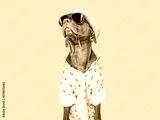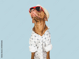 Lovable, pretty brown puppy and red sunglasses. Travel preparation and planning. Close-up, indoors. Studio photo, isolated background. Concept of recreation, travel and tourism. Pets care