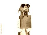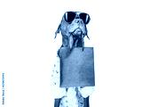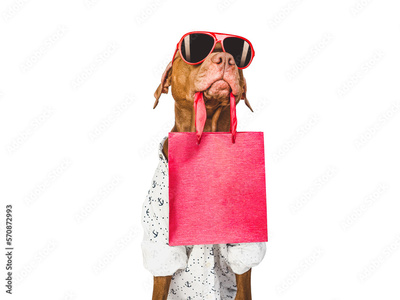 Cute puppy and a shopping bag. Sales preparation. Closeup, indoors. Day light, studio photo. Isolated background. Concept of care, education and raising pet