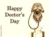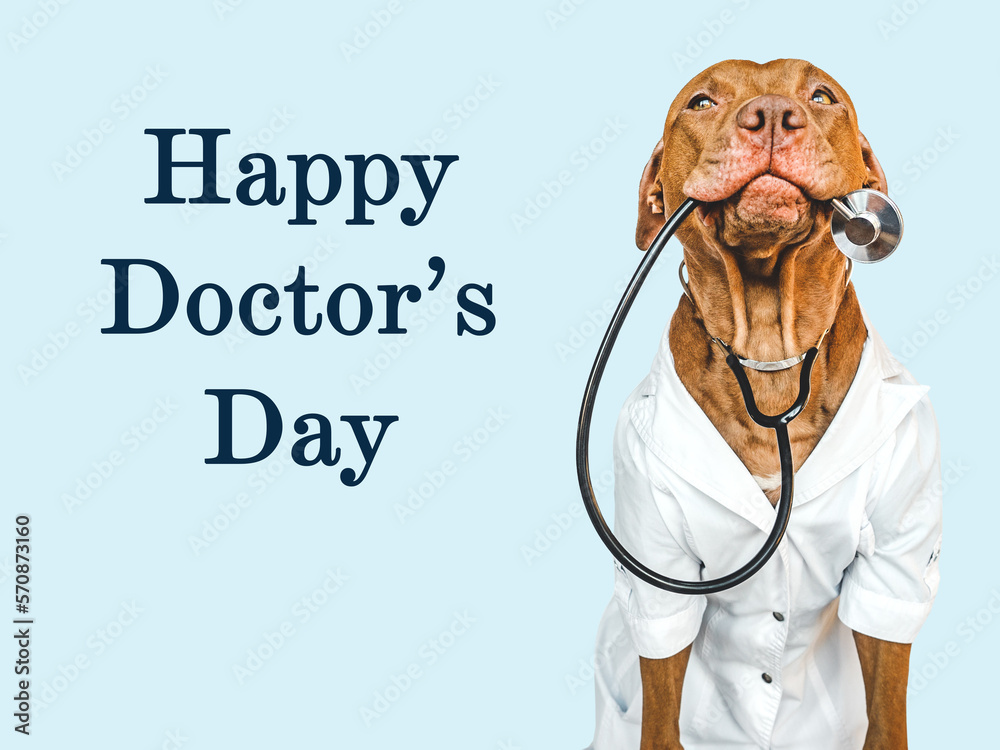 Happy Doctor's day. Lovable, pretty puppy, dressed in a doctor's coat. Closeup, indoors. Studio photo. Pets care concept