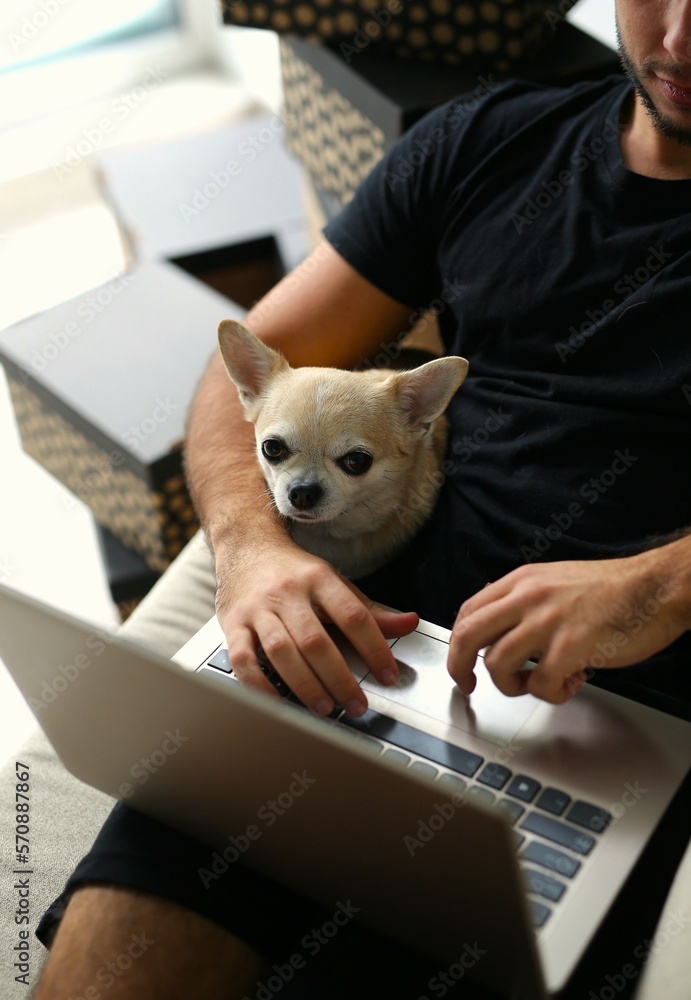 a twenty-five-year-old guy is at home with his dog, the guys spend time together, watch a movie, work on a laptop and have fun, models are stylishly dressed, a modern house in a minimalist style