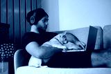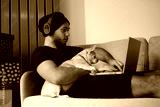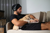 a twenty-five-year-old guy is at home with his dog, the guys spend time together, watch a movie, work on a laptop and have fun, models are stylishly dressed, a modern house in a minimalist style