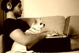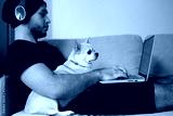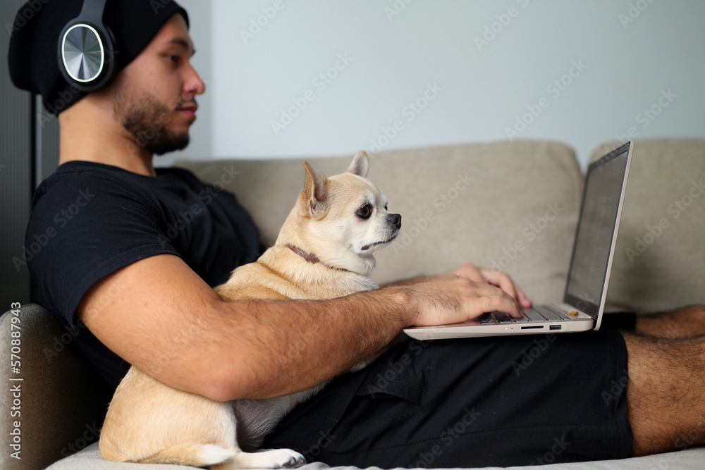 A stylish man in black clothes is at home, the guy works, watches a movie, studies on a computer. With a guy at home, a Chihuahua dog, a faithful friend and helper