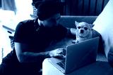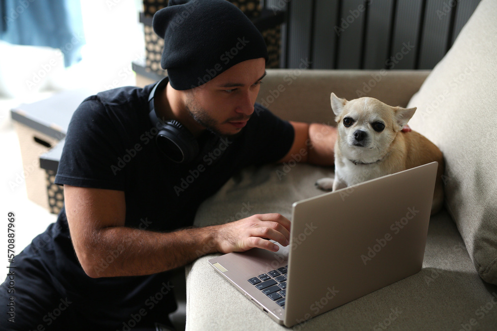A stylish man in black clothes is at home, the guy works, watches a movie, studies on a computer. With a guy at home, a Chihuahua dog, a faithful friend and helper