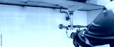 Technician plumber using a wrench to repair a water pipe under the sink. Concept of maintenance, fix water plumbing leaks, replace the kitchen sink drain, cleaning clogged pipes is dirty or rusty.