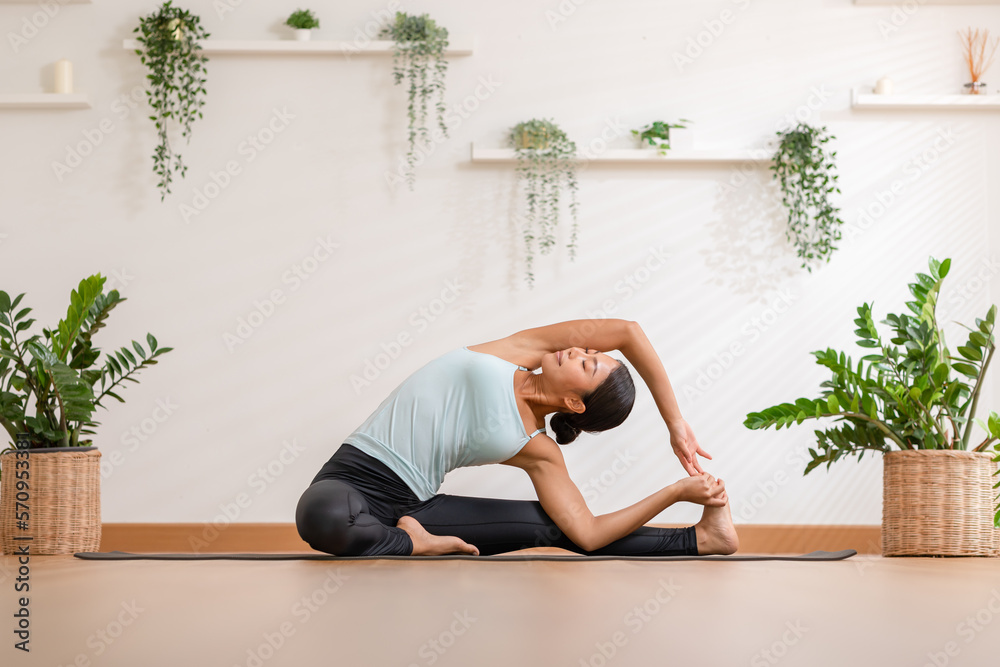 Fit and focused Asian woman practicing yoga in the comfort of her own home. Wearing comfortable clothing, she is performing various yoga poses in living room. Surrounded by natural light and peaceful