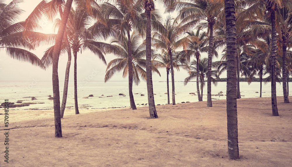 Tropical beach with coconut palm trees at sunset, color toning applied.