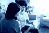 Side view of happy multiracial lesbian couple looking at positive pregnancy test together at home sitting on the couch.