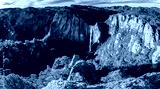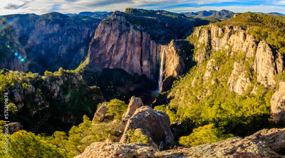 panoramic of long waterfall in green valley, mountains with forest and blue sky at afternoon, basaseachi chihuahua