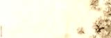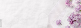 romantic spring or Mother's Day banner / background with closeup purple lilac flowers and silk ribbon on a soft fabric background, top view / flat lay