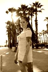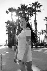 Young woman with vitiligo posing outdoors on the street near palm trees.