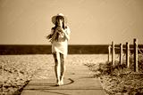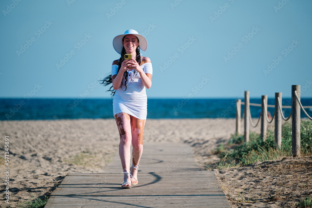 Woman with vitiligo using a mobile phone while walking on walkway at the beach.