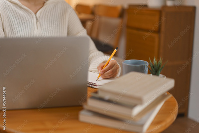 Nightlife concept, Young woman working on laptop and writing data in notebook at late night winter