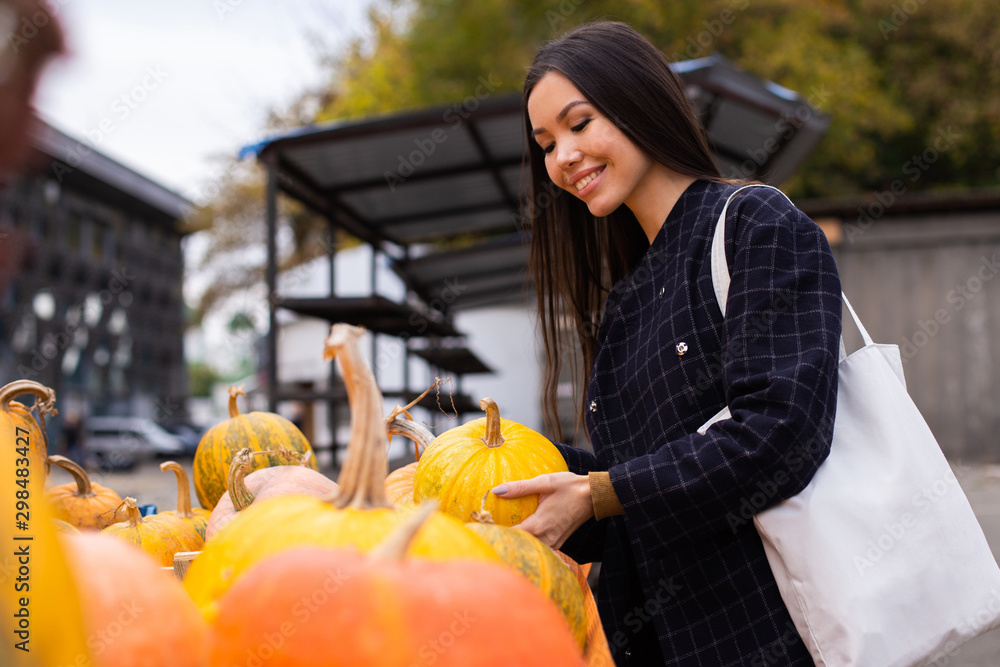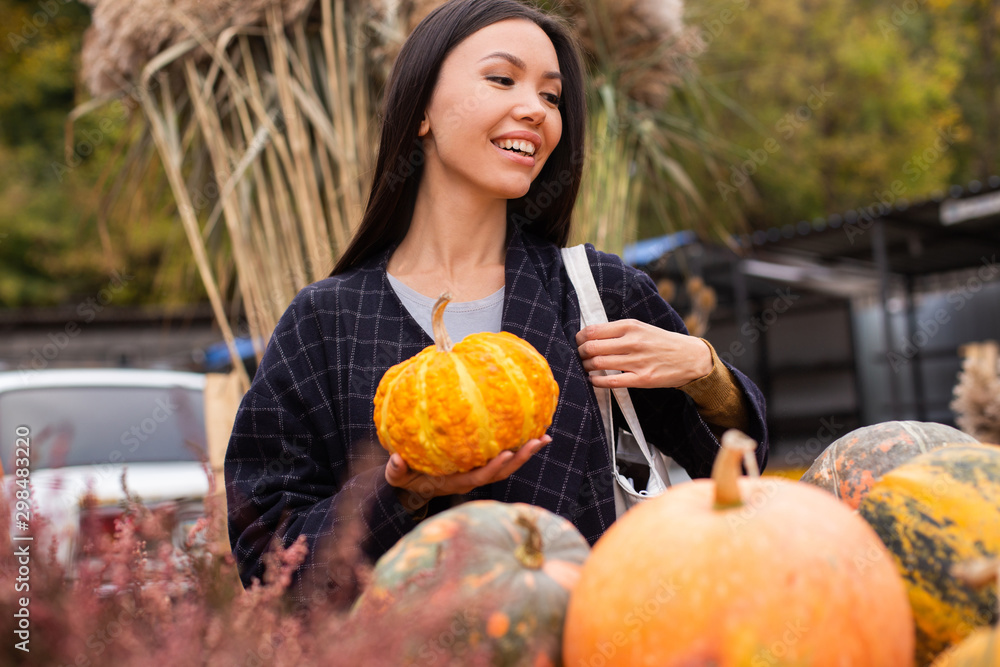 Beautiful Asian woman holding brown blank craft paper shopping bags and showing smartphone on screen background, PNG transparent.