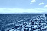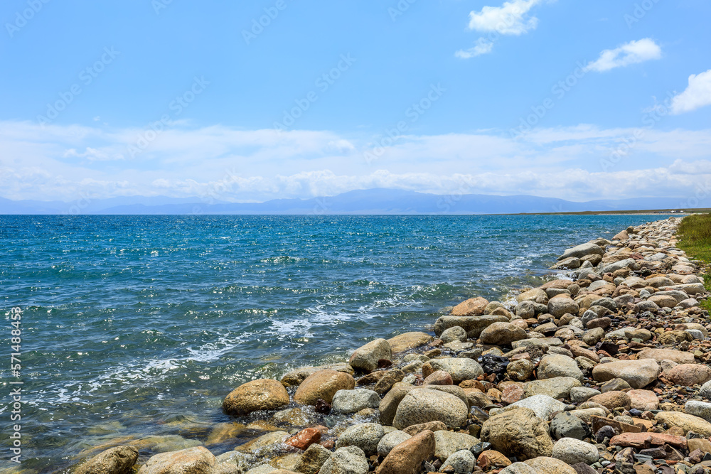 Beautiful Sayram Lake natural scenery in Xinjiang, China. Clear lake water and rocks under blue sky.
