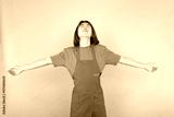 Relaxed asian man with long hair raising the arms