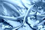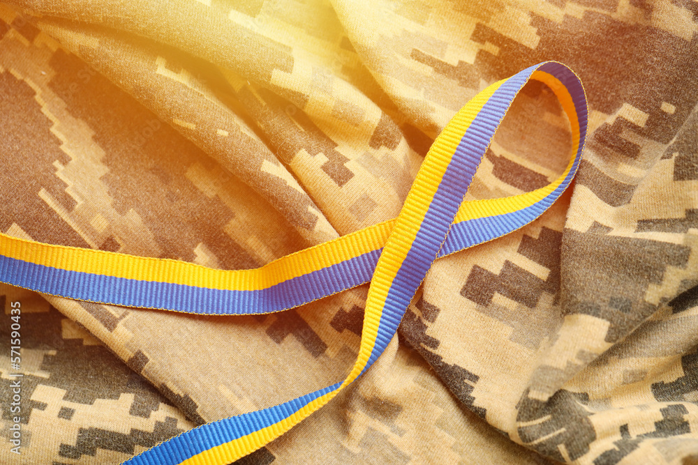 Pixeled digital military camouflage fabric with ribbon in blue and yellow colors. Attributes of ukrainian patriotic soldier uniform
