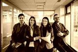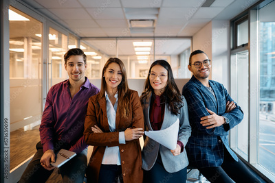 Multiracial group of happy business coworkers in office looking at camera.