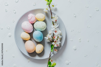 Top view colored easter eggs on the gray plate, blooming tree branch in vase and flower petals on the white table. Happy Easter and springtime card. Minimalism and simplicity. Selective focus.